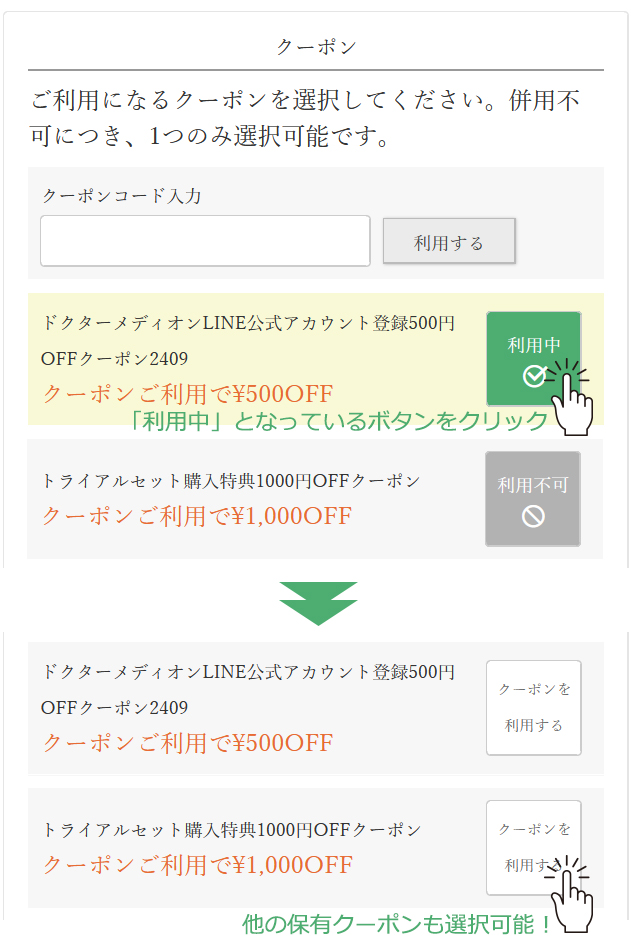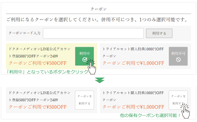 「利用中」となっているクーポンがあっても、クーポンコード入力欄に利用したいクーポンのクーポンコードをご入力いただけましたら切り替わります。